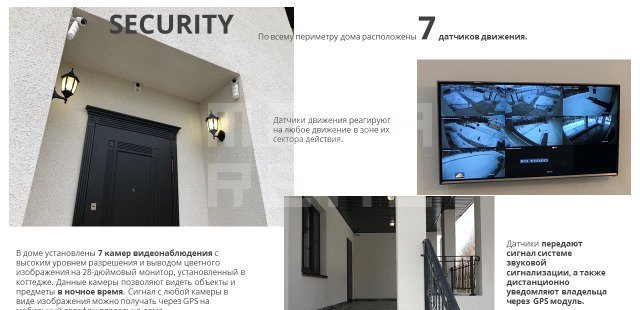 Система видеонаблюдения и сигнализации (7 видеокамер, позволяющих оценивать ситуацию на 360 градусов вокруг дома, вывод изображений на монитор 28') с датчиками движения и GРS оповещением.